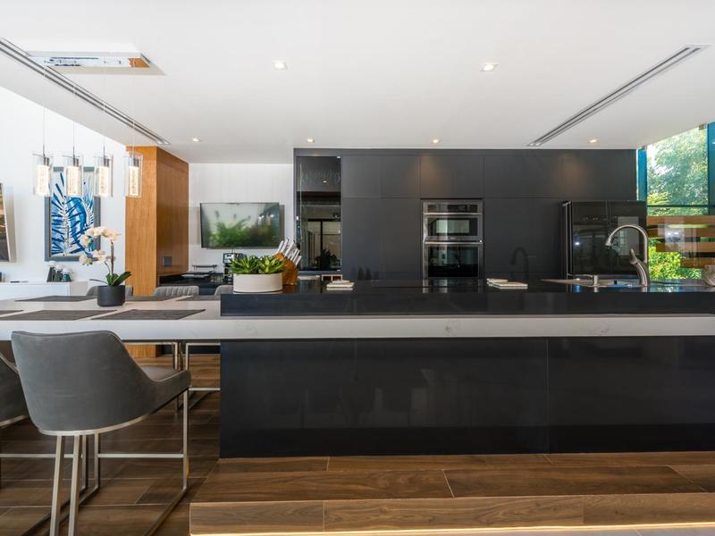 The kitchen is a masterpiece in itself, featuring sleek black cupboards with teak accents that infuse a contemporary flair. High-end Samsung Bespoke appliances ensure culinary excellence, while the programmable Wi-Fi thermostat in each room keeps the climate just right. There is central air throughout the home and it is programmable by room.