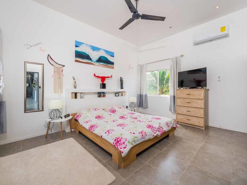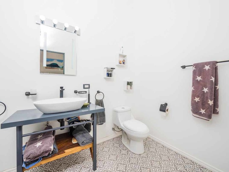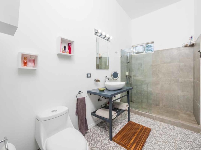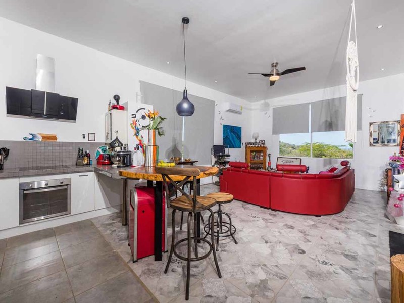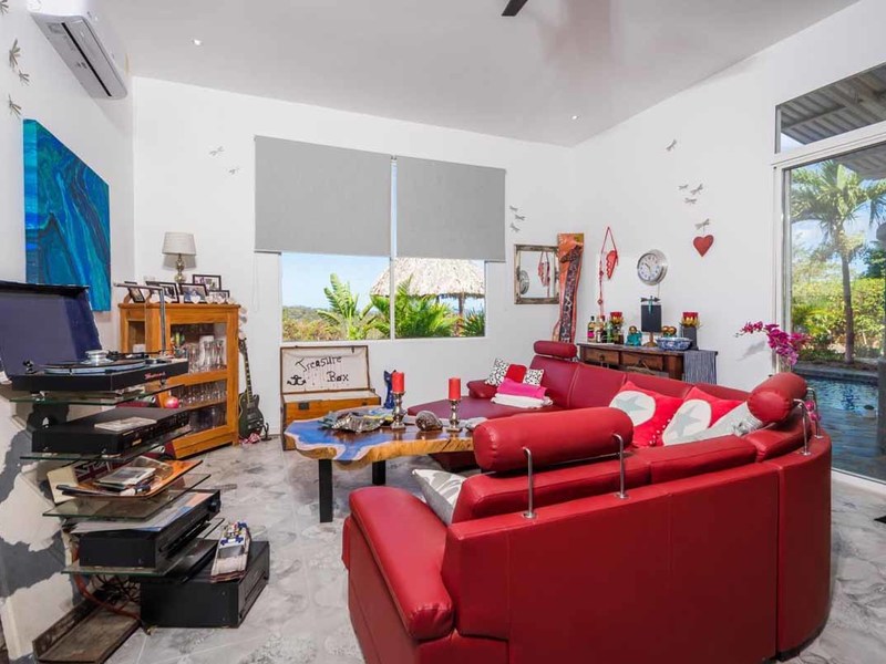 Let’s return to the outside patio area where you will be spending all your time! There is a Tiki Bar, a Guanacaste table, a dining table, and teak chaises to soak up the sun! This area was designed to have a good time! The unique lighting and laser show equipment will be sure to WOW your guests! To your right is a bedroom with an ensuite that overlooks the pool. To the left, a wall of windows takes you into the main home: bright, white walls, high ceilings, and lots of windows to soak up the incredible views. The living room leads right into the eat-in kitchen, which is a dream with its modern white cabinets and stainless-steel appliances. Down the windowed hallway are 2 bedrooms and 2 bathrooms, each with huge, glass-walled showers, vessel sinks, and mosaic-tile floors. The entire home is furnished in an eclectic mix of modern and bohemian and is completely move-in ready.