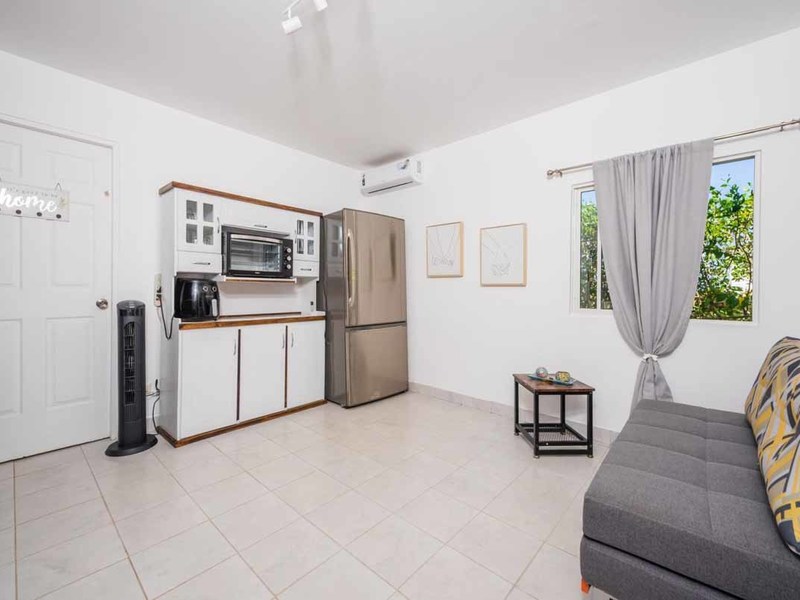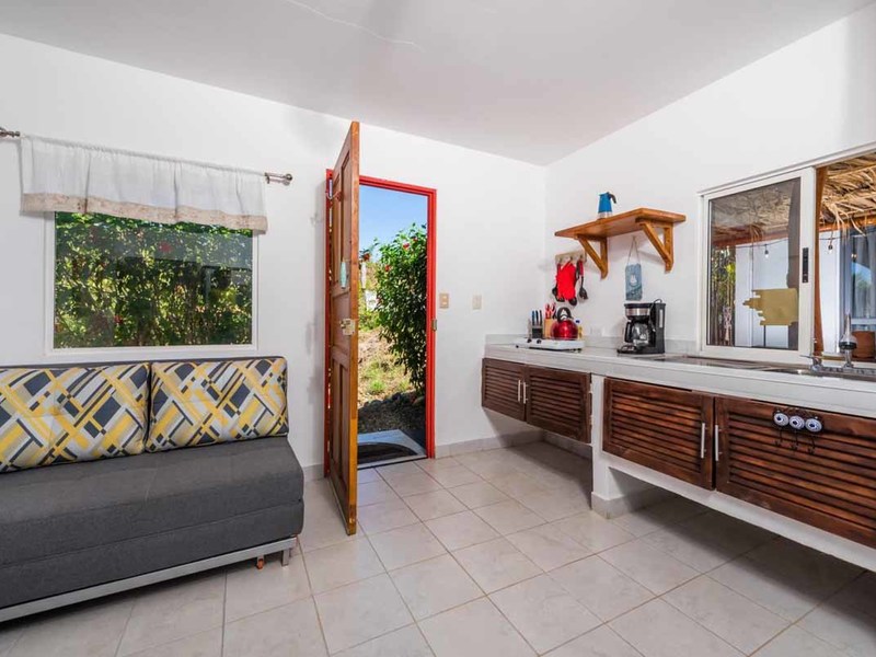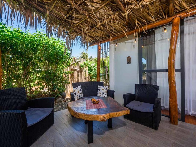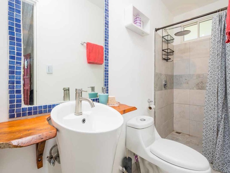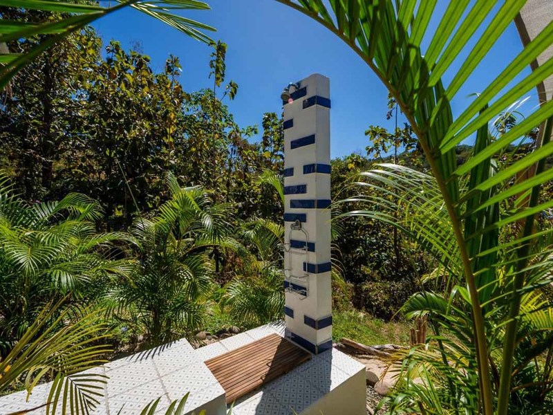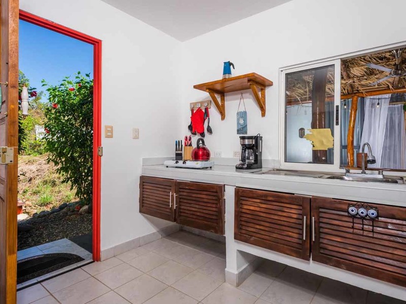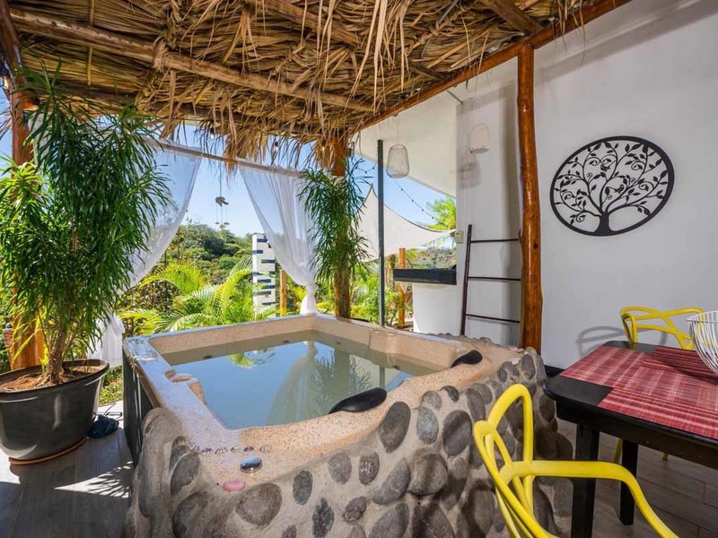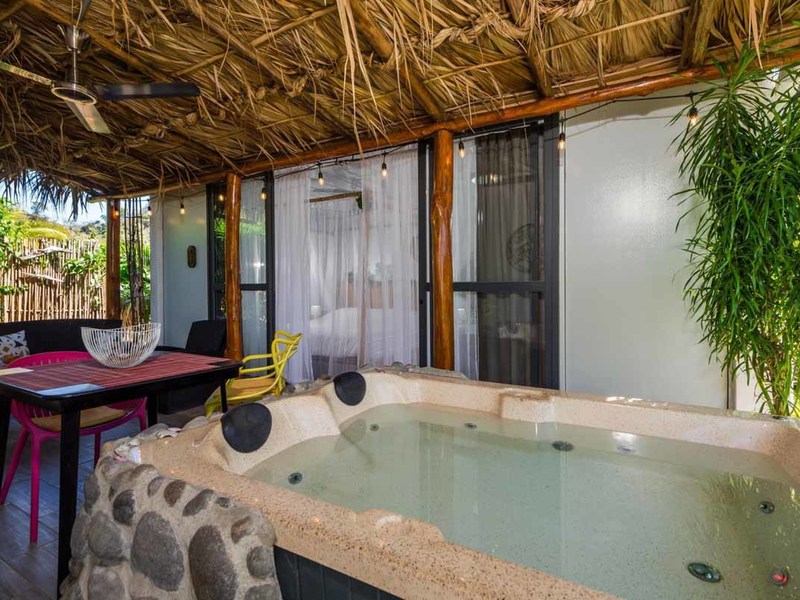 When you enter the gated property you will pass the brand-new guest house on your left. There you will find a private oasis for your guests or renters. It has a bedroom with an ensuite, a separate kitchen and living area, and in the middle a covered patio with a thatched roof that holds an outdoor living and dining area and a 2 personal jacuzzi that overlooks the jungle and the ocean. Also there, you will find an outdoor shower and a covered hammock area to watch and listen to the wildlife!