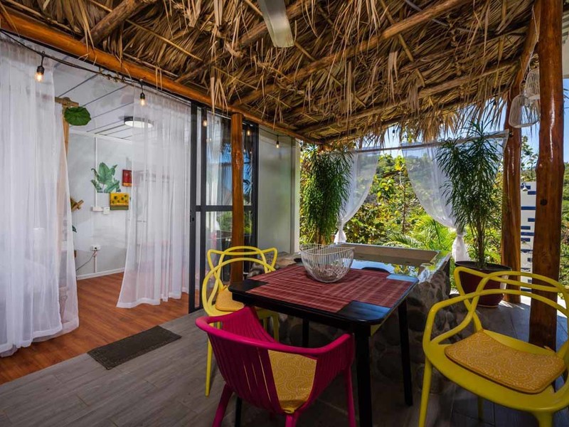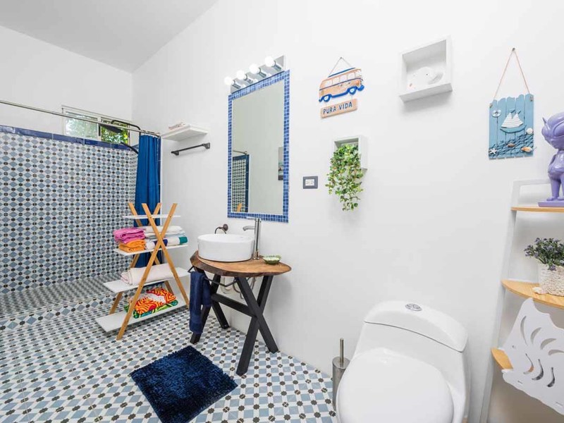 Next, you arrive at the main house of Casablanca. You are greeted by a wide, stone staircase that leaves you in the heart of the home—the outdoor space. In front of you is the cobalt blue pool set in a cool, stone patio surrounded by beautiful tropical plants, flowers, palm trees, and gorgeous views of the mountains, jungle, and ocean. There are 2 covered palm huts - one with a fire pit and custom-made teak chairs and the other with a swinging bed. Just below the pool is an orchard of native fruit trees with many banana and citrus fruits. This property was designed for the complete enjoyment of the Pura Vida life!