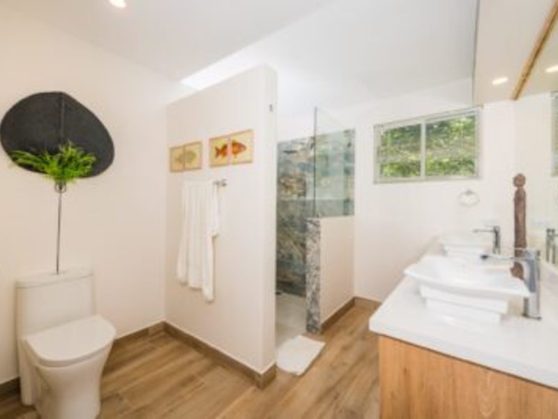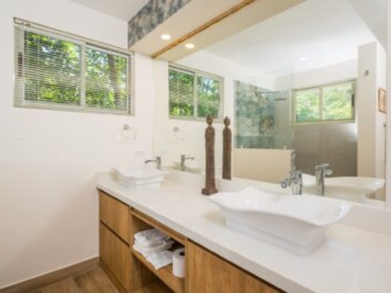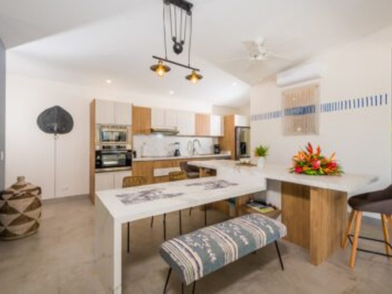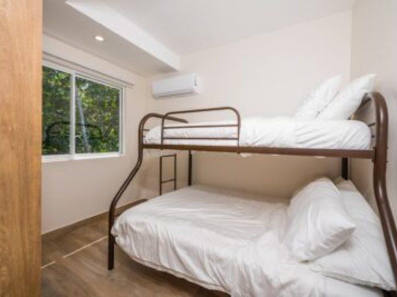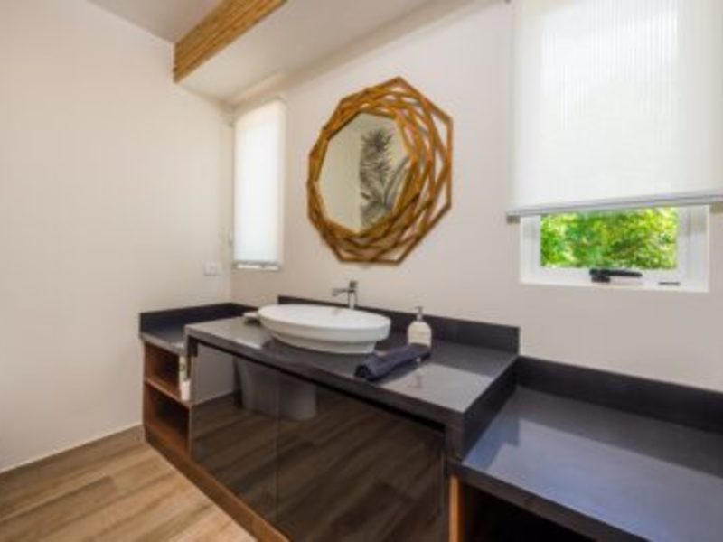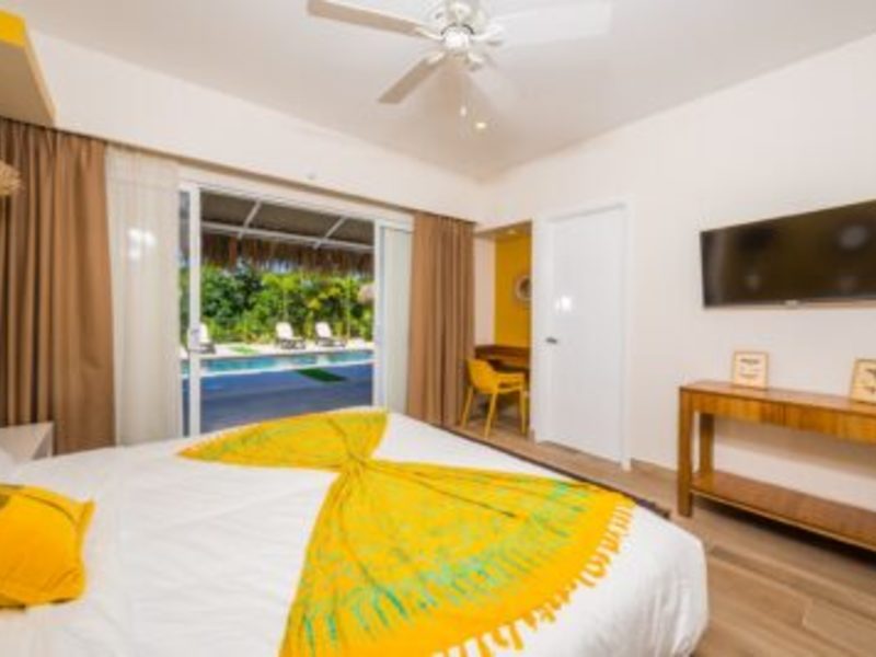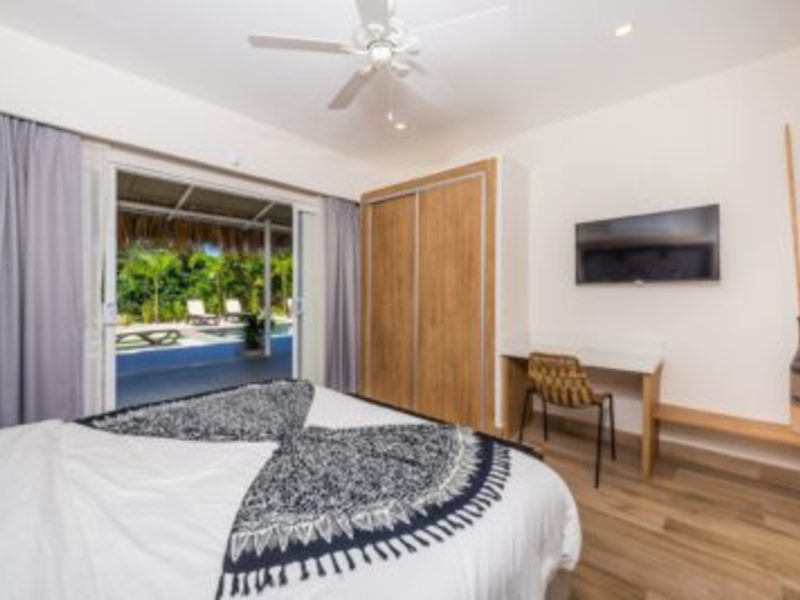Each of the 3 bedrooms opens onto a large wrap-around covered terrace and the pool, ensuring that relaxation is always just a step away. Every bedroom features a king bed, beautiful decor, and its en suite bathroom. Additionally, the third bedroom offers a bonus 4th bedroom with bunk beds, sharing the bathroom with bedroom #3.