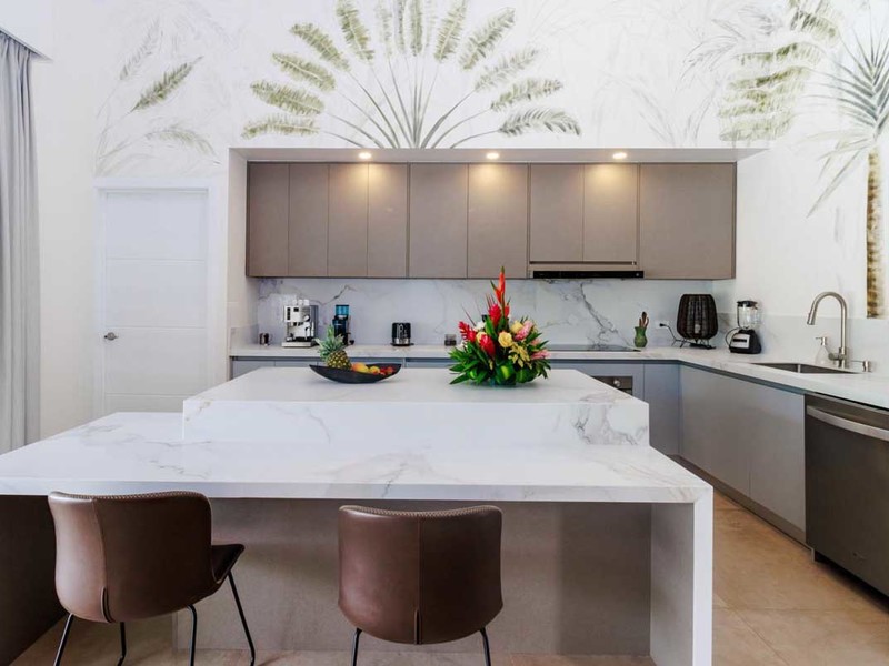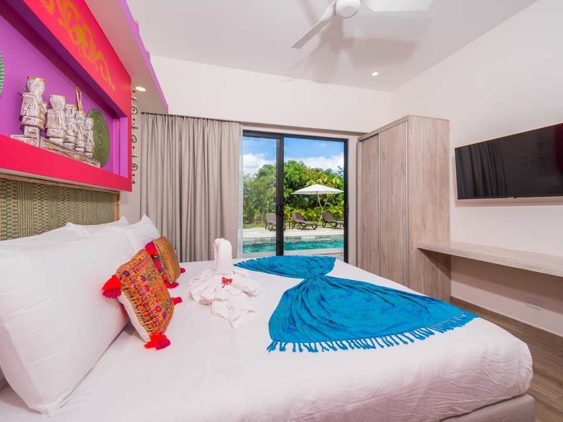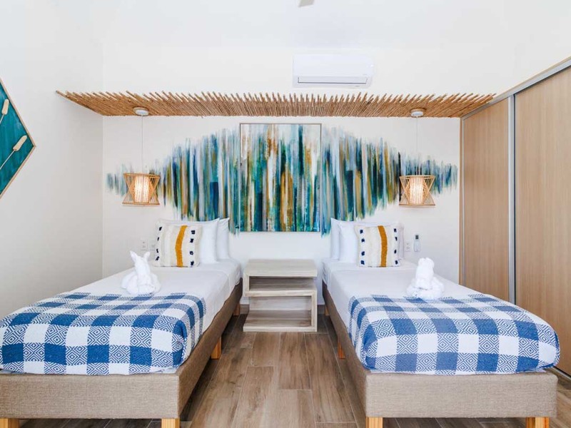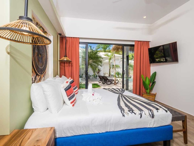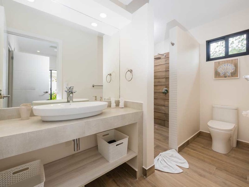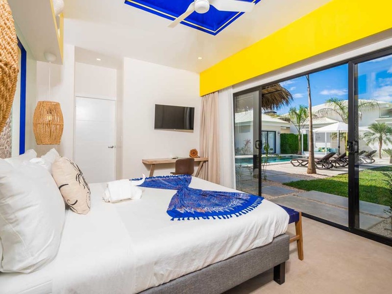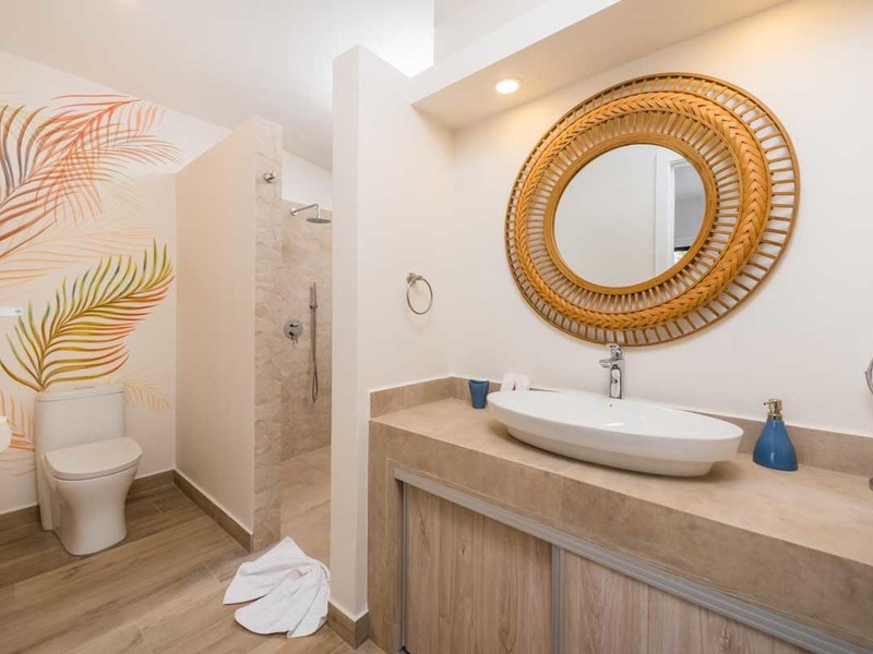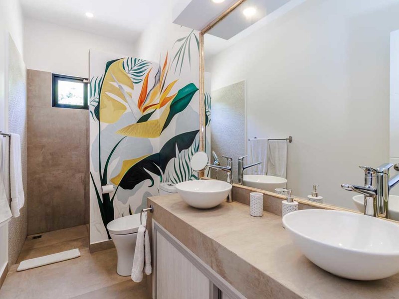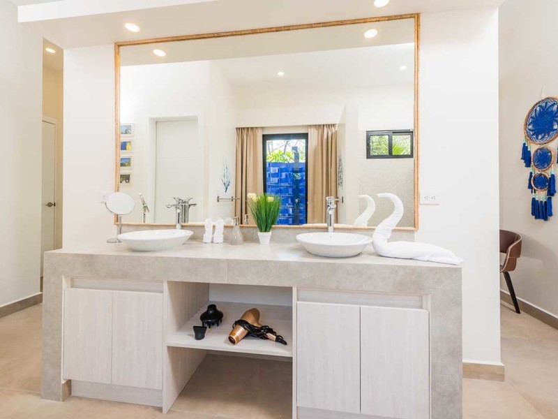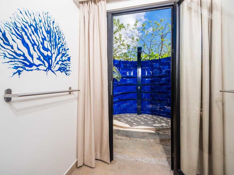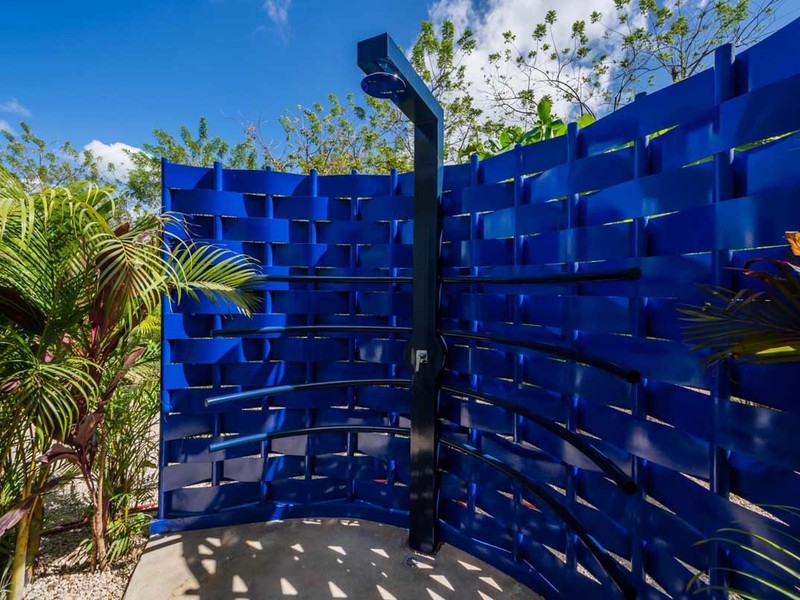 Off the kitchen to the right is the main bedroom. Its bright yellow and blue decor was inspired by Yves St. Laurent’s home in Morocco. The ensuite bathroom has an indoor and custom-designed outdoor cobalt blue shower lined by tropical plants. Off the other end of the main living area are 2 more bedrooms, both with King beds. One has a Caribbean vibe and the other a Beachy vibe, each with its own on-suite bathrooms and patio doors to the outdoor gardens and pool area.