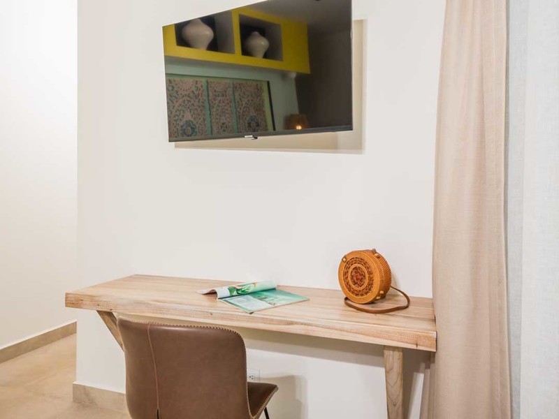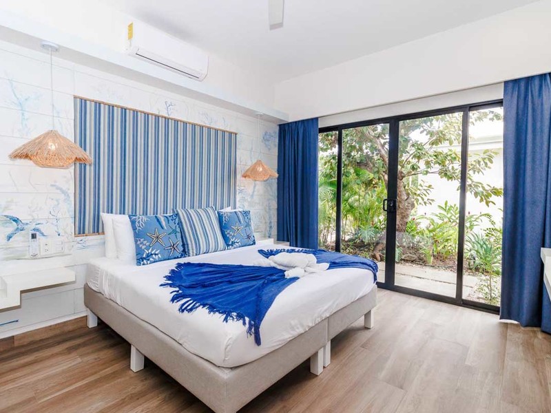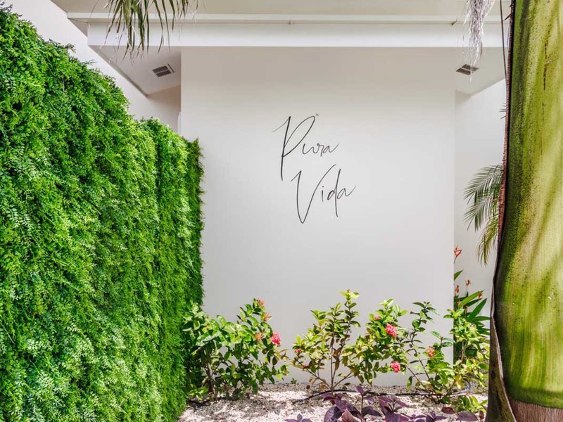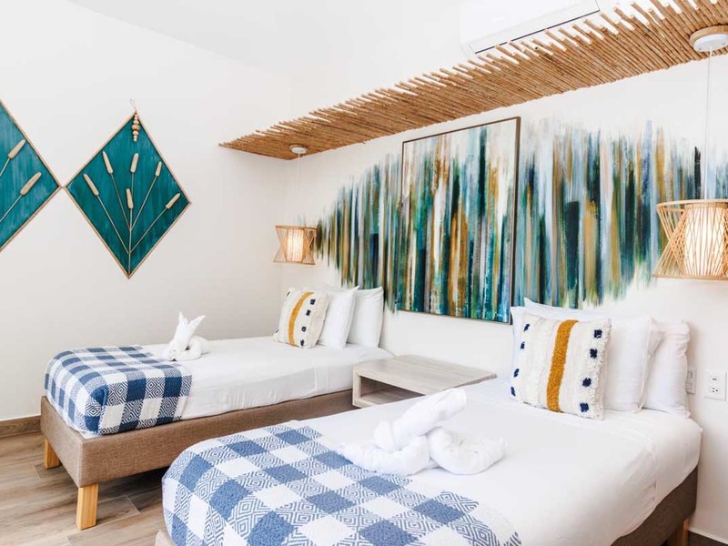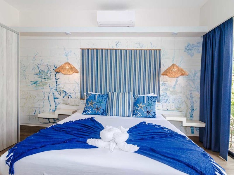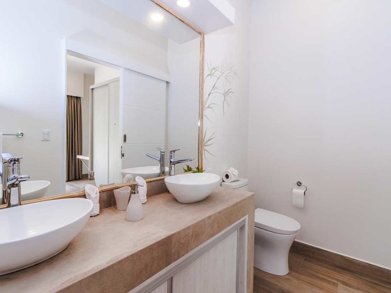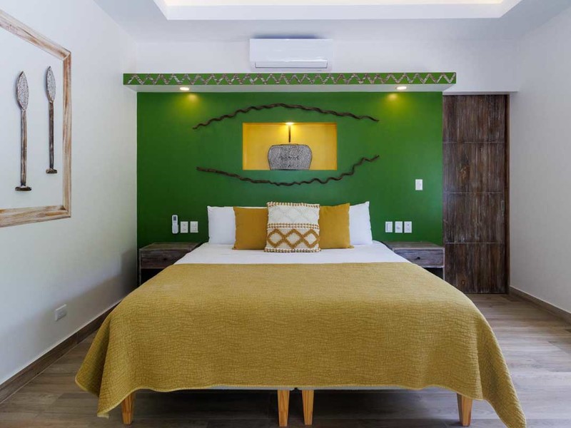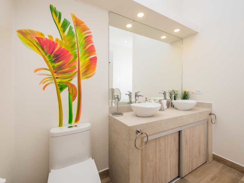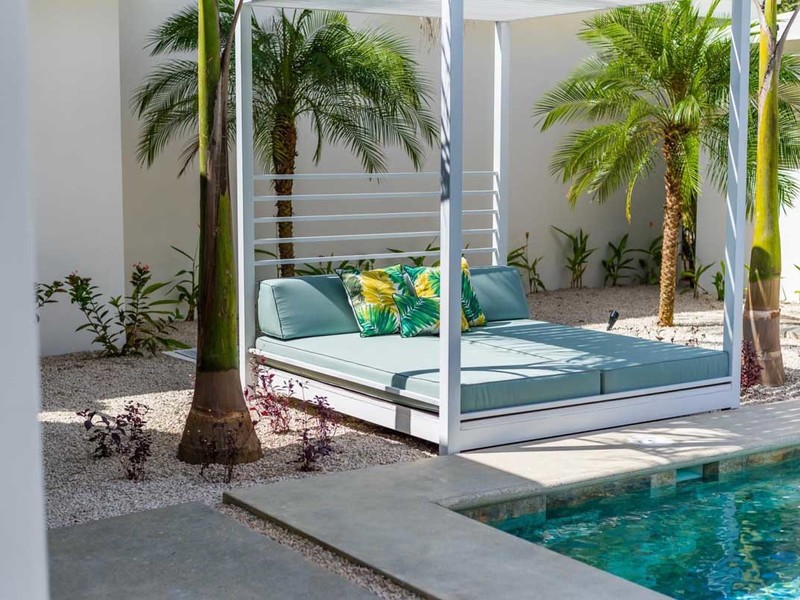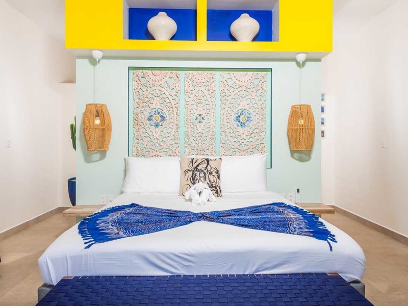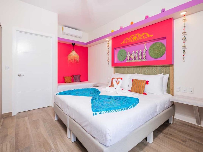 Off the kitchen to the right is the main bedroom. Its bright yellow and blue decor was inspired by Yves St. Laurent’s home in Morocco. The ensuite bathroom has an indoor and custom-designed outdoor cobalt blue shower lined by tropical plants. Off the other end of the main living area are 2 more bedrooms, both with King beds. One has a Caribbean vibe and the other a Beachy vibe, each with its own on-suite bathrooms and patio doors to the outdoor gardens and pool area.