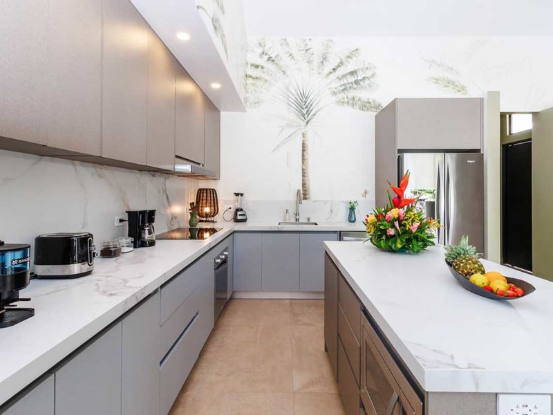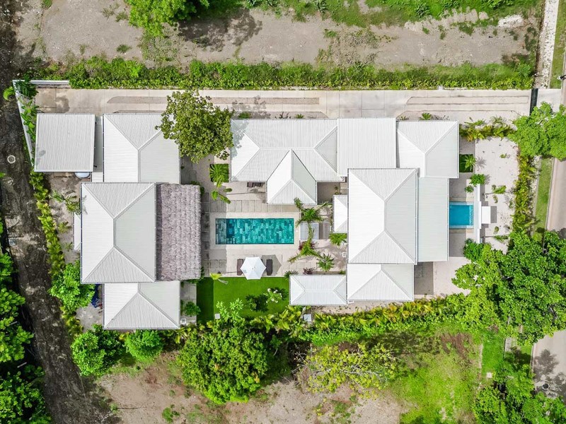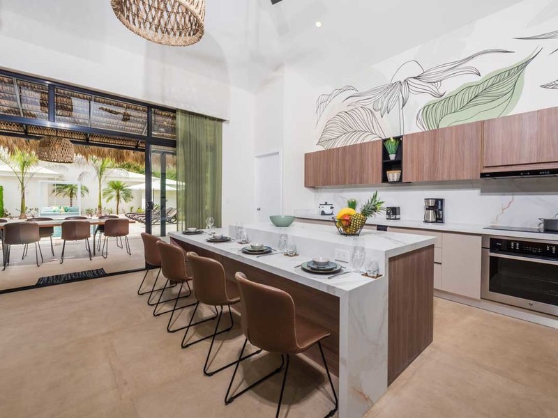 The 2500 sq ft main house, located at the back of the property and backing onto a gorgeous large treed farm features three structures. It is perfectly set up to accommodate large groups of people. The first one has an open area living room/ kitchen with patio doors to a large covered outdoor space that opens up to the back yard, and three bedrooms each with ensuite bathrooms and patio doors that face the pool. The second has 2 large bedrooms, each with patio doors and they share one bathroom. The third structure is a half-bathroom with an outdoor rain shower. The Fiji-inspired, open-plan living, dining, and kitchen areas have custom artwork on the wall. The kitchen is covered in modern cabinetry, and the waterfall-edge dining table is at arm’s reach for serving a quick snack after a day at the beach. There is ample and comfortable seating in front of a unique wall of built-ins centered around the television for family movie night. Steps outside the great room is a beautiful and large thatched palm-roof lanai that faces the sparkling pool and gorgeous tropical gardens.