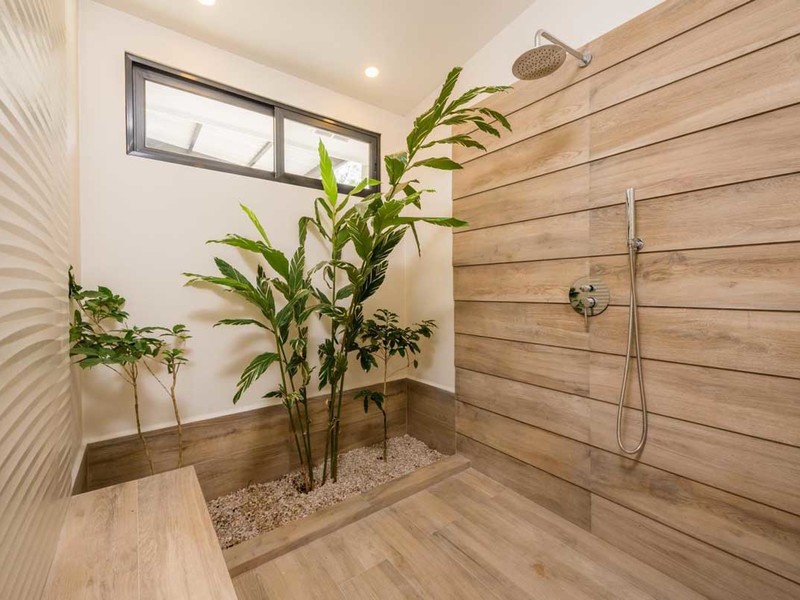The backyard has been professionally landscaped with many native tropical plants that attract hummingbirds, butterflies, and daily flocks of green parrots. Near the pool is an outdoor rain shower and a half-bath with a unique stone sink. Enjoy a relaxing nap on an outdoor bed under a slatted pergola. Soak up this Pura Vida life!