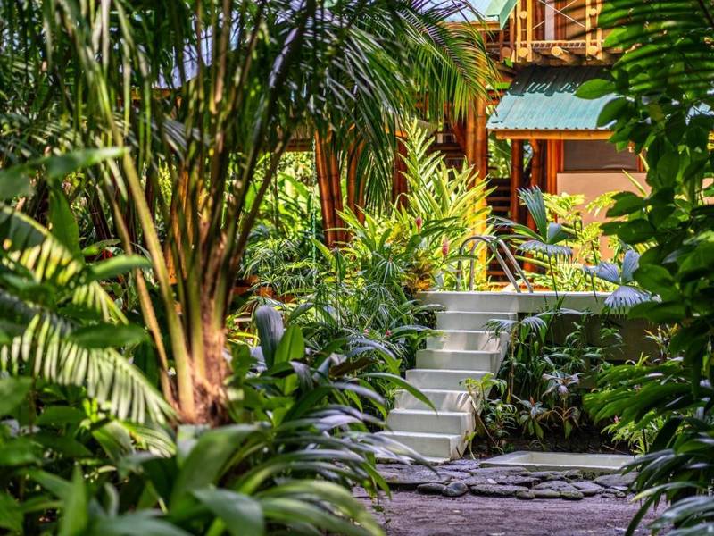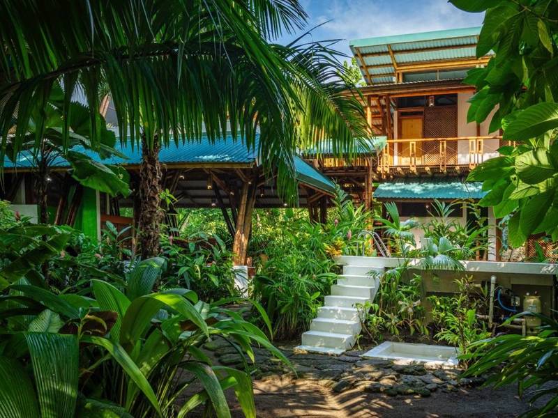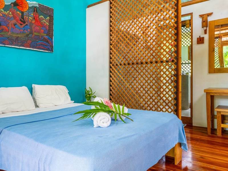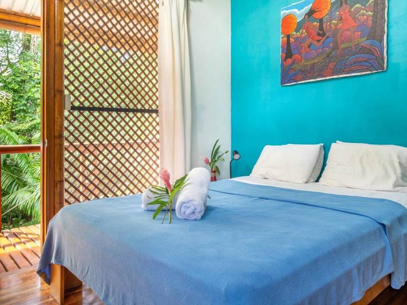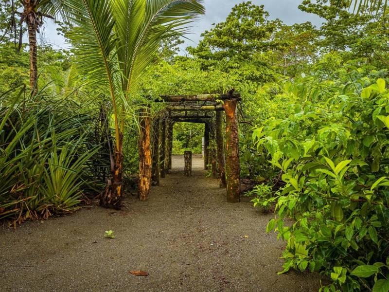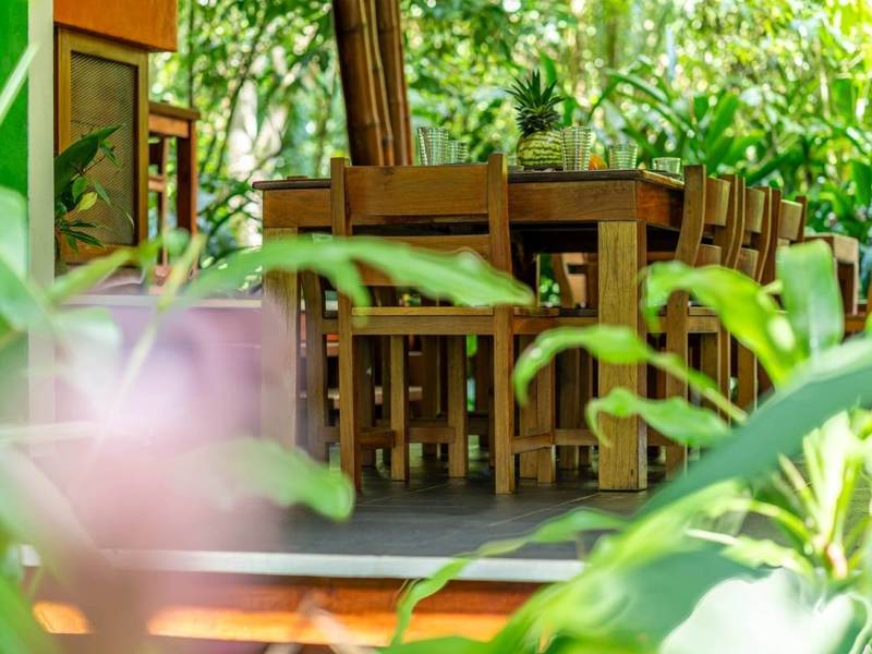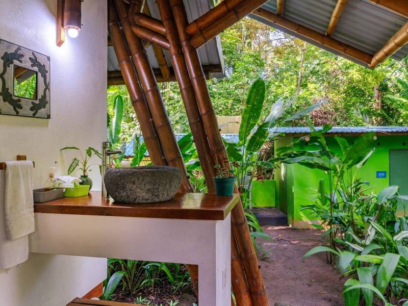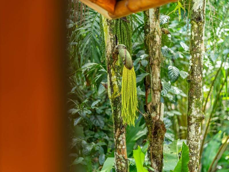 Tucked away behind the main house is an area filled with various fruit trees like bananas, plantains, pineapples, mangoes, and different citrus trees. If you venture further along the pathway behind the property you'll discover mangroves and a creek. Wildlife is abundant here – it's not uncommon to spot macaws occasionally encountering monkeys, sloths, or even an anteater.