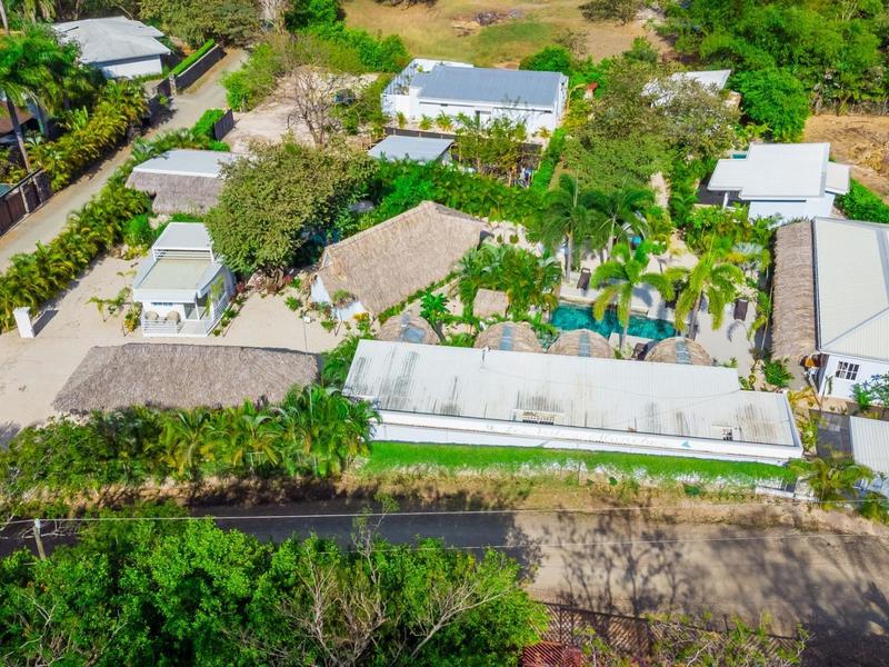 These 5 cabins share one large ceramic tiled pool with an entire waterfall wall. There is an outdoor hand-painted shower beside the main pool. On the back side of the pool is a spacious 915 sq ft building with a high, vaulted ceiling and a large covered terrace all under a thatched roof—this is where your guests will enjoy their breakfasts or sit on the comfortable couches and make new friends. It is possible to have a restaurant here too to generate more income. Behind the scenes is a spacious, fully equipped kitchen with 2 fridges ready to turn out delicious meals.