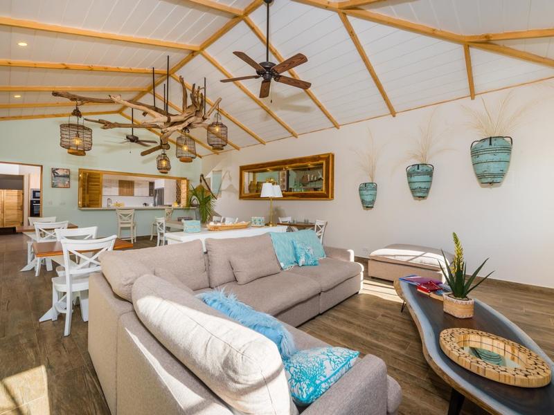 Just ahead are 5 delightful 1-bedroom, 1-bathroom cabins, each with very private outdoor living areas under arching thatched roofs. There are four identical sized 377 sq ft cabins, each is uniquely decorated in an ocean theme with tranquil colors and original artwork, each has a King bed, desk, fridge, and coffee maker, and all face the gorgeous, large turquoise swimming pool and waterfall. One of the cabins is larger at 538 sq ft and has a large covered terrace outback.